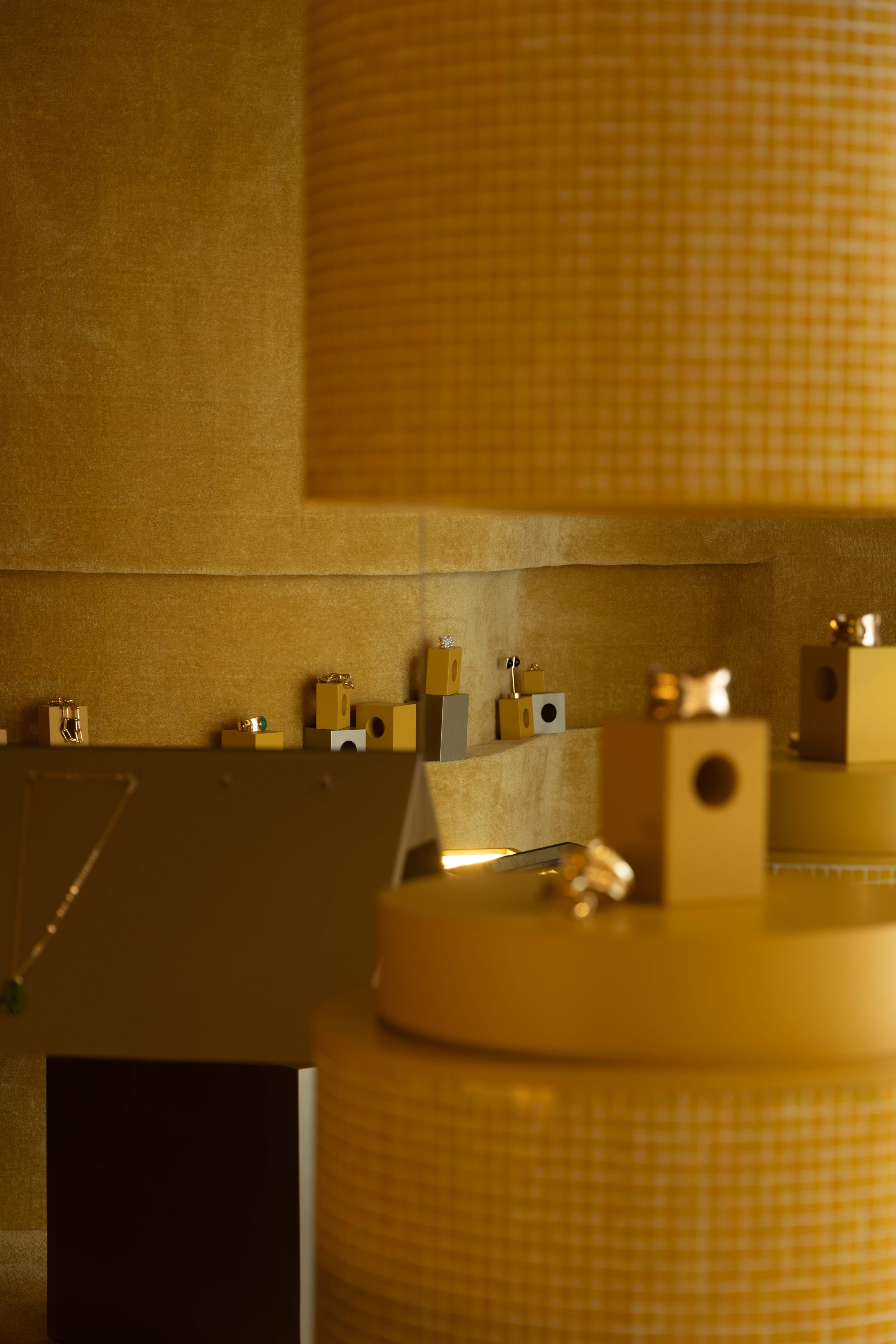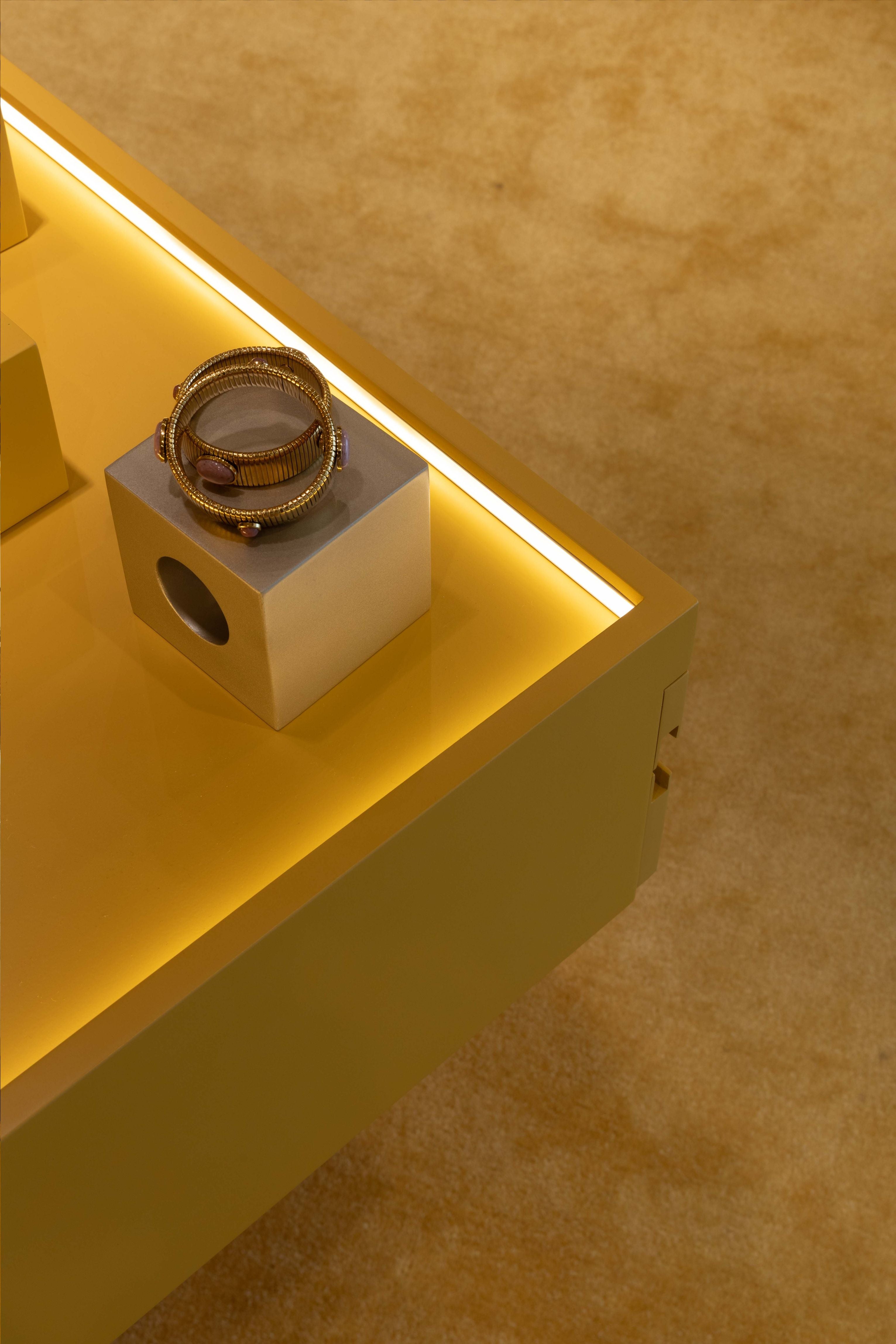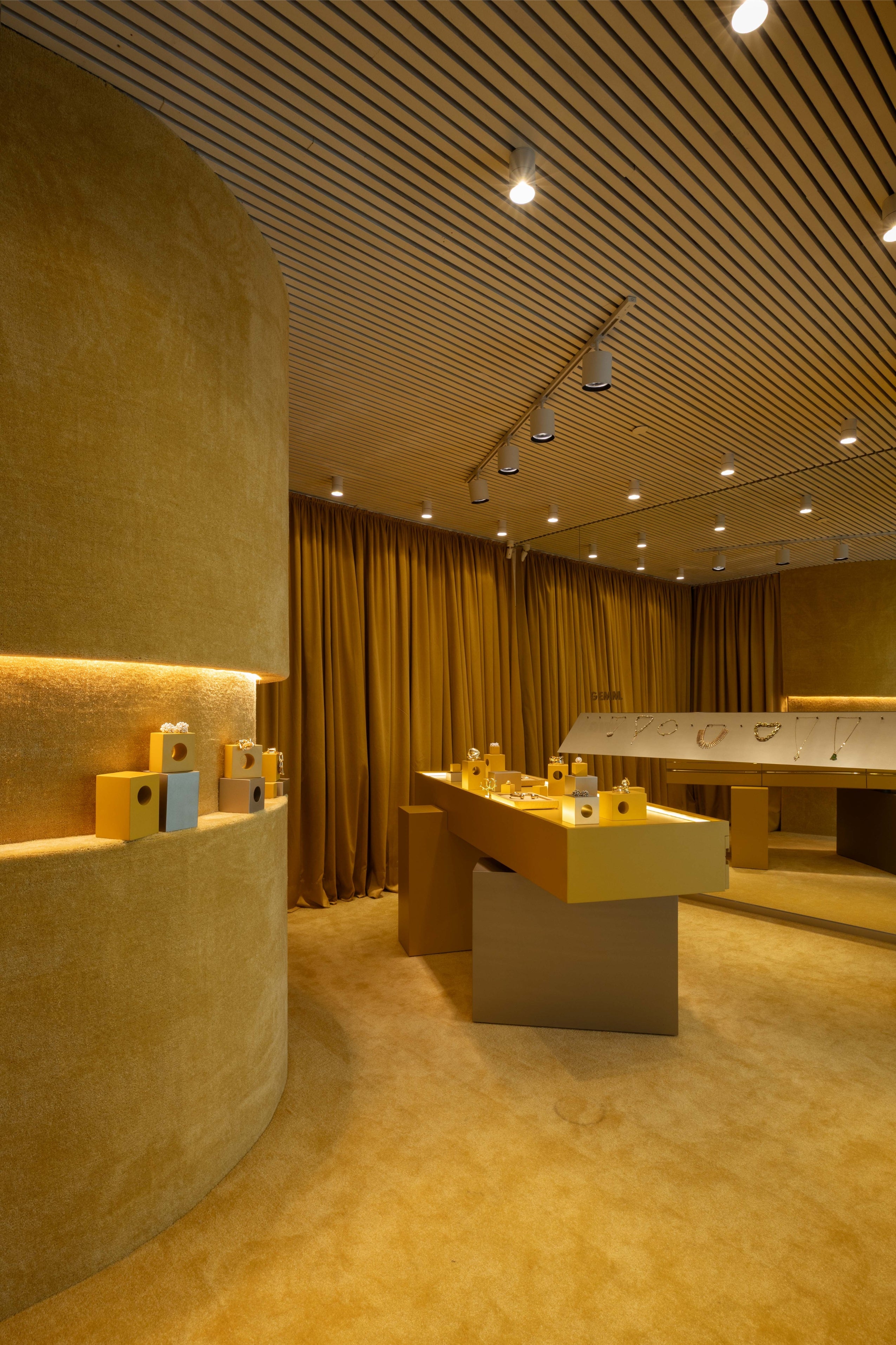 A arquitetura da loja GEMM, assinada por Luciano Dalla Marta, nasce da ideia de uma gema rara observada ao microscópio, revelando marcas naturais únicas, como uma impressão digital. Esse conceito se materializa na mesa central, que simboliza essa impressão digital.